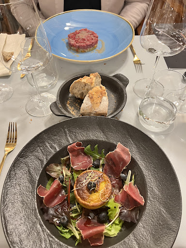 La cucina è gourmet, con prodotti provenienti dalle loro tenute: carni, salumi, olio e vino. Il menù, pur non essendo lunghissimo, soddisfa pienamente ogni gusto. Abbiamo iniziato con antipasti di salumi e una giardiniera home made davvero eccezionale. Come secondo, un controfiletto di fassona servito con julienne di carciofi e patate, accompagnato da una fonduta di vin brûlée spettacolare in cui intingere ogni boccone prima di portarlo alla bocca.