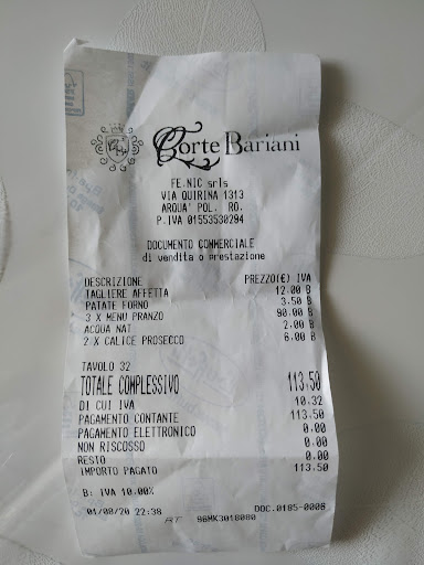 Ieri sera assieme alla mia famiglia e a due amici siamo tornati a Corte Bariani. PESSIMA ESPERIENZA! Non mi è mai capitata una cosa simile! Ma andiamo per gradi. Circa 2 anni fa siano andati a mangiare la pizza gourmet e ci era piaciuta molto. Ieri sera avevamo prenotato convinti di mangiare pizza ma appena siamo arrivati ci è stato comunicato che il sabato sera non fanno pizza. Sul sito questa informazione non è indicata e non ci è stata comunicata al momento della prenotazione. Appena ci siamo seduti al tavolo a bordo piscina abbiamo trovato sul il menu: un unico foglio stampato solo da un lato, in stile menù matrimonio, con elencati 4 o 5 antipasti di pesce, 4 o 5 primi di pesce, 4 secondi di pesce e 1 di carne. NESSUNA INDICAZIONE DEI PREZZI!!! Ripeto: NESSUNA INDICAZIONE DEI PREZZI!!! Inoltre non era indicato nemmeno se si trattava di un menù fisso. Ma è legale??? Abbiamo quindi chiesto se c'erano portate fuori menù e ci sono stati elencati: pinzini con affettati e formaggi, tagliolini al ragù tagliata di manzo. Abbiamo ordinato pinzini + salumi + formaggi per le bambine, 2 antipasti + 2 primi + 2 secondi… sempre all'oscuro dei prezzi. Hanno servito prima gli affettati per bimbe, i 2 antipasti e uno dei secondi. Gli affettati sono arrivati SENZA formaggi e senza pinzini, e non è stato servito nemmeno un po' di pane, portato invece, prima di noi, al tavolo accanto dove sono arrivati 20/30 minuti dopo di noi. Dopo aver chiesto 2 volte ai camerieri informazioni sui pinzini e sui formaggi, circa 20 minuti dopo uno di noi si è alzato ed è andato a chiedere spiegazioni a una delle cameriere (che poi abbiamo scoperto essere la figlia della titolare) che in pochi minuti ha portato al tavolo pinzini, 4 fettine di pane e formaggio grana. Mentre i 2 antipasti erano discreti, il secondo era una misera orata di dimensioni minime, al massimo 200 grammi, ancora da pulire e ricoperta di patate e olive forse per mascherarne le dimensioni. Dopo circa mezz'ora sono arrivato i 2 primi, 2 risotti ai gamberi, e l'ultimo dei secondi, coda di rospo con pomodorini e fuori do zucca. I risotti avevano un forte gusto di aceto, li abbiamo mangiati solo per fame, e in ogni piatto era presente solo mezzo gamberetto. Il secondo invece aveva solo 2 pezzetti di coda di rospo, 3 fiori di zucca fritti e zero pomodorini. Vista la pessima esperienza abbiamo preferito non ordinare altro e siamo andati alla cassa per pagare dove la titolare era già stata informata dalla figlia della nostra insoddisfazione e si è giustificata dicendo che probabilmente siamo capitati nella serata sbagliata… ma dei 113€ del conto si è accontentata di riscuotere "solo" 110€. Inoltre non capisco perché ci siano stati addebitati 3 menu quando abbiamo ordinato 2 antipasti + 2 primi + 2 secondi. Per concludere: la location è molto bella, soprattutto d'estate; i camerieri sono molto gentili ma poco professionali e poco accorti ai clienti, nessuno di loro ci ha informato che c'era un menu fisso o qualcosa di simile; gli ingredienti sembravano discreti ma i piatti erano preparati e presentati veramente male. Probabilmente ci tornerò quando cambieranno gestione....
