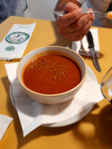 A Small place to take a break from a long hike or ride,staff are warm and accomodating,cozy place,clean and functional although it is a temporary establishment due to the earthquake that destroyed most of this place. FOOD are great,Lentil soup was amazing 👍.We spent 30€/head appetisers, 1st course and 2nd course house wine,drinks (water and Coca-Cola) coffe...