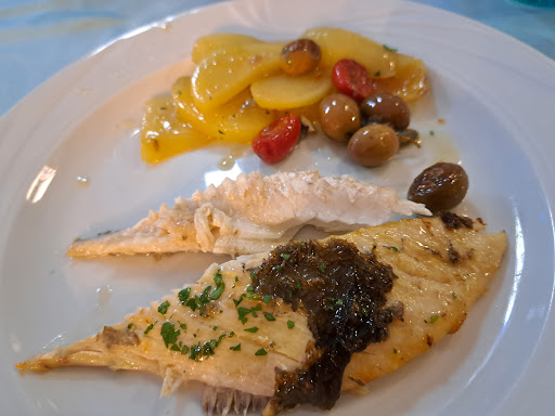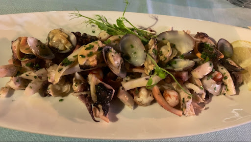 It's the third time I've been in the village and wonder why I haven't been to this place before. We had a big mussels bowl as antipasti. Then spaghetti with clams, ravioli with fish filling and the best seafood fregola that I ever ate. As main we had a big San Pietro Fish, which was pricy (130 euro) but worth and amazing to share. It comes with potatoes and olives and great sauce.