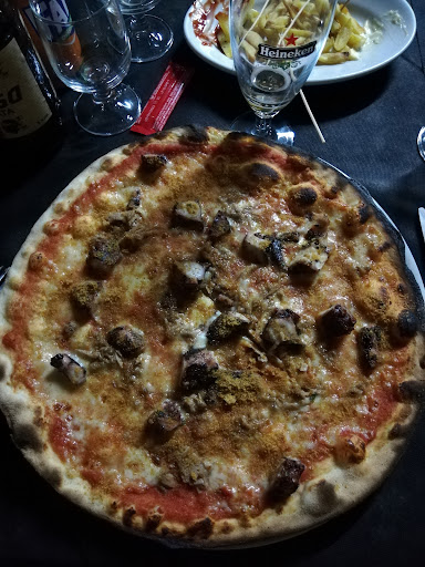 Locale spartano, sala unica separata da mezzo muro. La cucina mi è sembrata fosse in stato di pulizia discutibile. Tempi medio lunghi, una sola persona in sala per una 40ina di persone, ma che nonostante tutto si destreggiava abbastanza bene servendo le pizze. Peccato non controllasse i tavoli abbastanza spesso, e parecchie son state le richieste di servizio ignorate. Le pizze sono sottili al punto da inzupparsi a causa del condimento. Quando tirata, la pizza si slabra e si sfalda come se fosse una membrana pallida di farina e acqua, non lievitata a sufficienza. I coltelli sono ottimi ma sono sprecati per questo tipo di pizza. Pizza passata al mattarello, lievi bruciacchiature, nulla da dire su questo. Le patate nella pizza, infornate assieme ad essa, erano ancora crude. Non sono state scottate prima della cottura e sono entrate probabilmente nel forno ancora crude. Ottimi invece i condimenti e la qualità degli ingredienti. Tutto sommato non male nel complesso. I dolci della casa purtroppo sono pochi. Uno è la "fragolata", ossia semplicemente fragole tagliate e versate in una coppa, apparentemente senza alcun condimento, se non con topping opzionale fatto con della panna spray comprata in un supermercato. Devo ammettere però che le fragole fossero perfette e saporite. Il tiramisù eccedeva col cacao in polvere ma tutto sommato era buono, tendente all'amaro. Prezzi nella media. Insomma, ottimi ingredienti ma onestamente credo la preparazione si possa migliorare, a partire dalla lievitazione e cottura della pizza.