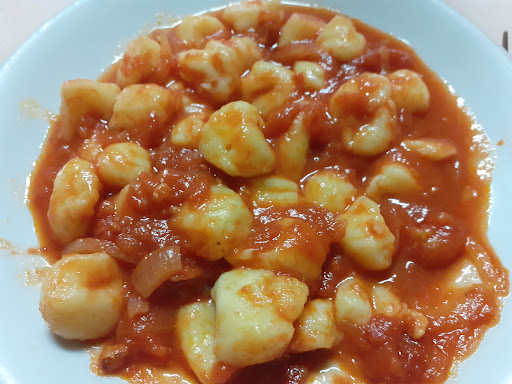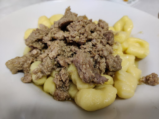 Ho provato degli ottimi gnocchi a pranzo, coi sughi a parte molto abbondanti, tanto che era un peccato lasciarli lì e una sana "scarpetta" col pane non guastava. 😉 Tornerò ancora senz'altro. *Aggiornamento: sono tornato per avere una visione più completa. E purtroppo, sarà che avevo aspettative alte dalla prima volta, ma sono rimasto deluso. Il servizio è certamente molto rapido...forse anche eccessivamente rapido. E per la troppa fretta si può sbagliare; sotto mi spiegherò meglio. Premetto che gli gnocchi sono sempre buonissimi come impasto, ma come sugo avevo scelto quello all'amatriciana e -chiedendo anche a chi è più esperto di me- passi per il guanciale, ma il pecorino ci deve essere e non ce n'era manco l'ombra. Altrimenti non chiamiamolo così, ma al pomodoro e basta. Un errore evidente e grave, che ho segnalato sia a fine primo che alla fine. Forse c'è stato un errore nella comanda, ma tant'è. Di secondo ho preso il rotolo di coniglio...è vero che in altri posti dove l'ho mangiato si scioglieva in bocca, ma nel caso di ieri era pressoché immangiabile e non si riusciva nemmeno a tagliare da tanto gommoso che era. Mi è stato chiesto alla fine e non potevo non segnalarlo. Ma osservando altre carni di passaggio, anche queste non mi parevano degne di nota. 😐 Magari potrebbero proporre meno scelta da menù, ma curarla meglio. I contorni erano scarni, asciutti, troppo. E anche il Macafame come dolce -una bella fettona- era mediocre e senza sapore. Con il caffè finale mi sono un po' rifatto il palato, che di sicuro un po' reclamava dal coniglio precedente e magari ci stava pure un limoncello offerto, ma pazienza. 30 euro il conto finale va bene, ma mi aspettavo decisamente di più...errore mio probabilmente. Concludendo: tolgo una stella...Potrebbero essere addirittura due, in realtà, ma li salvano gli gnocchi, perchè emerge veramente il gusto della patata. Allora: posto che sicuramente si distingue per gli gnocchi, che sono buonissimi a livello di impasto. Ma solo e unicamente per quelli. Forse ho sbagliato scelte o serata, ma nel complesso in altri locali della zona mi sono trovato meglio. Perciò in pausa-pranzo eventualmente ci tornerò ancora per un piatto di gnocchi. Per una cena completa in futuro non credo. Mi...