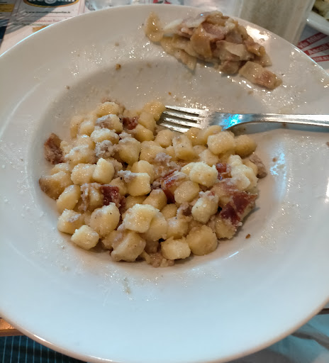 Frequento saltuariamente questo locale da almeno quattro anni e sono sempre stati un ottimo riferimento per rapporto qualità/prezzo/quantità, nonché per varietà dell'offerta gastronomica. Già all'ingresso (proprio appena entrati sulla sinistra, accanto alla farmacia), si può vedere la combinazione non comune di menù per tutti i gusti e le varianti, a partire da €. 7,00. Al posto del pane, ti portano un'ottima focaccia bianca, fatta dal forno/pizzeria appena accanto, e il caffè, con ogni esigenza da bar, lo consumi al banco del bar sempre accanto, peraltro ottimo. Unico appunto: un po' meno sale in alcune pietanze e, soprattutto, meno grasso in altre (ad esempio, gnocchetti, ottimi, con salsiccia, se aggiungi la pancetta croccante, evita di aggiungere il guanciale - che difatti abbiamo tolto - , altrimenti, più che un piatto, diventa un attentato al sistema cardiocircolatorio). Complimenti al Personale (mediamente giovane) e in cucina,...