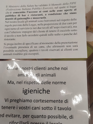 Io e mio marito siamo stati a cena lo scorso sabato, in compagnia della nostra cagnolina. Vorrei fare una premessa: oggi, prima di scrivere, per curiosità ho letto un pò di recensioni e per questo motivo, mi vorrei rivolgere a quegli avventori che si sono lamentati circa il "trattamento" riservato a chi ha dei cani al seguito: è necessario capire che, al contrario di chi li possiede, non tutte le persone apprezzano il fatto di mangiare vicino ad un cane, piccolo o grande che sia. Quindi, il fatto di tenere il proprio animale sotto al tavolo, è semplice educazione e rispetto per gli altri. Inoltre serve per dar modo al personale di potersi muovere agevolmente tra i tavoli, senza rischiare di rovesciare i vassoi con piatti o bevande che stanno trasportando. Per impedire ad un cane qualche scatto improvviso..magari anche semplicemente per la gioia di vedere un suo simile..ma che potrebbe causare il rumore di cani che abbaiano. O far inciampare il personale o altri clienti! Al momento della prenotazione bisogna sempre specificare la sua presenza e non si tratta di essere relegati in un angolo...ma di rispetto nei confronti degli altri clienti presenti. Noi abbiamo trovato le istruzioni sul tavolo, scritte in modo molto gentile e con richieste che dovrebbero essere scontate...per chi ha un minimo di educazione! Per quanto riguarda la nostra esperienza, proprio sabato sera, oltre alla nostra Alice, c'era un cane di grosse dimensioni, poco distante da noi e altri TRE, di taglia media, un pò più in là...ma siamo stati disposti in tavoli abbastanza distanti, ed i nostri i cani ( tutti ben educati!!) sono stati al loro posto e non c'è stato nessun tipo di problema!