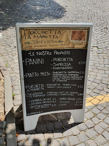 Il locale non prevede possibilità di prenotazione; semplicemente si arriva e ci si fa accompagnare nel primo posto libero dal personale. La maggior parte dei tavoli sono da condividere con altri commensali; a dividere i gruppi seduti ci sono delle simpatiche piantine che contribuiscono a rendere l’ambiente molto piacevole. I tavoli sono davvero semplici, tavoli e panche da sagra, ma la location è molto suggestiva: si mangia infatti sotto le fronde di alti alberi che rendono il luogo ombreggiato e fresco, una piccola oasi naturale tra le romantiche vie di Asolo. Purtroppo però la tovaglia del tavolo al quale siamo stati fatti accomodare non era stata accuratamente pulita e c’erano delle briciole. Per ciò che riguarda la consumazione, invece, per pranzare abbiamo preso panini con la porchetta e piatti con patate, fagioli e porchetta. Tutto buono, anche se la porchetta non è stata tra le più buone e saporite che io abbia mai mangiato. Più invitanti mi sono sembrati i panini con la soppressa. Inoltre una cosa che non ho gradito: nei nostri panini con la porchetta era presente dell’olio d’oliva, dal sapore gradevole ma che a) non era stato da noi richiesto e b) non era specificato in nessun luogo (menù, stand all’ingresso del patio o alla cassa) che ci sarebbe stato nel panino con la porchetta. Rivedrei pertanto...