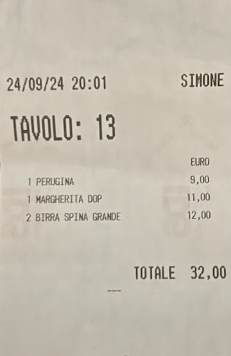 We ordered the: La Regina Margarita €9.00 Perugina €9.00 2 Peroni €12.00 Total: €30.00
