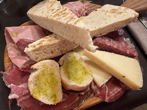 Ambiente semplice ma carino ma non ha tantissimi posti. Ho mangiato solo il tagliere dei salumi e formaggi, come qualità buona e lo consiglio..ma mi raccomando, uno é sufficiente per due persone cosa che doveva essere specificata sul menu oppure detta a voce, perché davvero per una sola persona diventa troppo oltre che spreco di cibo perché per quanto possano essere buoni, sono troppi. Il servizio ha lasciato un po’ a desiderare, molto approssimativo, perché per esempio Abbiamo chiesto un calice di vino rosso, é arrivata la cameriera, ha messo nel calice il vino e non ha nemmeno minimamente specificato di che vino si trattasse. Poi hanno portato i taglieri e non hanno nemmeno spiegato cosa ci fosse nello specifico come affettati e formaggi…abbiamo mangiato alcune cose non sapendo nemmeno cosa fossero e poi “i formaggi” consistevano in due pezzettini…peccato però che erano identici…buoni ma uguali…quindi si tratta più che altro di un tagliere di salumi, buoni ma solo salumi e tra l altro non identificati nello specifico. Ovviamente essendo troppi abbiamo chiesto la cortesia di portarci qualcosa per poterli riporre a portargli via, avevamo lasciato anche un pezzo di pane tipico di queste parti di cui ora mi sfugge il nome e che ovviamente non ci è stato “presentato” quando hanno portato il tagliere(era parte del piatto)…Si sono resi disponibili a darci qualcosa per portarli via ma si sono portati via i piatti e hanno voluto riporli loro in un pezzo di stagnola, che andava benissimo però non hanno lasciato nemmeno la fettona del “pane”tipico molto buono che era avanzato..Insomma diciamo che consiglio il tagliere di affettati perché buoni. il servizio ha qualche mancanza o forse ho beccato la...