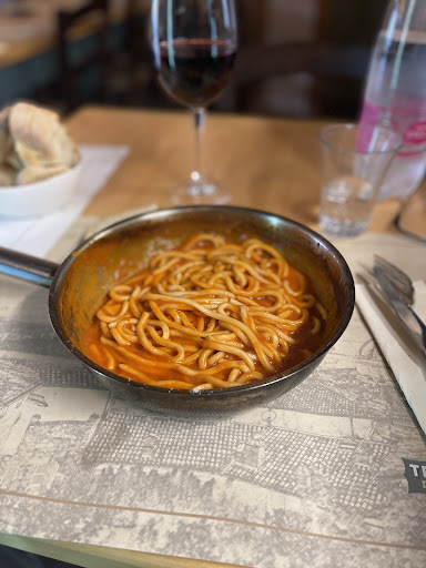 Read moreI came expecting great things based on reviews and recommendations from a famous travel advisor. I was pretty disappointed by my pasta dish and even more so by the veal. Neither were presented very well. The spaghetti dish was presented in a frying pan, which was unique, but there were zero garnishes to provide visual interest. It tasted okay; just the right amount of spiciness. The veal, however, was way overcooked to the point of being dry. The sauce, of which there wasn't much, was okay. The presentation could have been much better; the veal came with a little sauce on it, a pile of fried sliced potatoes, and that was it. Looked a bit sorry to me. The glass of house red paired well with the spicy pasta dish. I stuck around for the recommended dessert and was happy with it; it was presented well and tasted delicious. It's a local favorite; a bit like an apple strudel but with nuts. It had vanilla cream added and was topped with powdered sugar. I really hope this place...