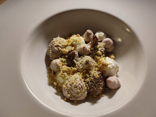 Ho avuto il piacere di assaporare un menu della serata che mi ha davvero colpito. Iniziamo con un antipasto di uovo biologico cotto a 63 gradi, accompagnato da patate di montagna, porcini freschi e una deliziosa fonduta di latteria: un piatto che esalta la qualità degli ingredienti e l'arte della preparazione.
