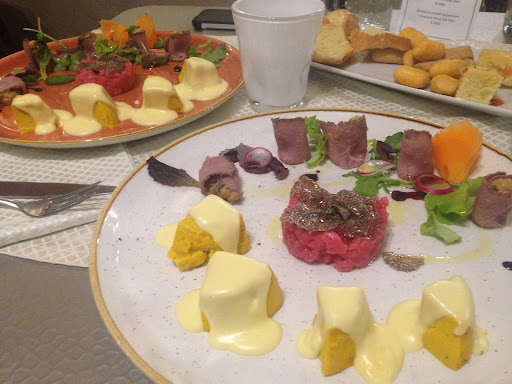 Siamo stati nella sala del piano di sotto e ci siamo trovati molto bene perché siamo stati serviti molto bene, con calma ma senza eccessive attese per i piatti ordinati. A ciò si aggiunge la tranquillità del locale, che permette di pranzare/cenare senza molto caos ma, appunto, in tranquillità. All’inizio viene offerto un tris di pane, crostini e focaccia da accompagnare con dei pomodorini molto gustosi. Il tagliere di salumi è molto buono e viene servito insieme alle zeppoline di pasta fritta (più o meno come lo gnocco fritto). La qualità dei salumi è alta e si sente. Come primo abbiamo scelto gli gnocchi con formaggio fuso e pesto di nocciole: ottimi! Alla fine vengono offerti dei dolcetti secchi, anche questi molto buoni. Lo consiglio vivamente sia perché si mangia molto bene spendendo il giusti, sia perché un po’ di tranquillità non fa mai male a nessuno, soprattutto quando si vuole staccare dalla frenetica...