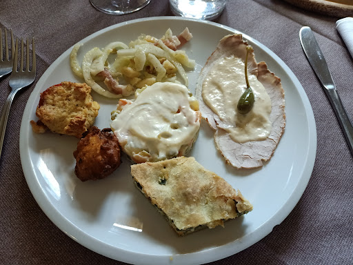 Locale accogliente, posto nella calma collinare. Cucina buona e casalinga, tradizionale. Oggi il menù era così composto: Antipasto misto con vitello tonnato; insalata russa; torta verde; insalata di finocchi, noci, prosciutto e formaggio stagionato; 2 frittelline. Un sacchettino con il Pan frittu, un tagliere con focaccia rossa, bianca e salamino. Hanno seguito due primi: Polenta con cinghiale; ravioli di borragine. Per secondo e contorno vi era l'artista di maiale cotta nel latte con Chips di patata e in più sono passati, per chi voleva, con del coniglio e delle lumache accompagnate da insalata belga gratinata. In chiusura ecco il tris di dolci, veramente molto buoni: torta di mele, panna cotta ai frutti di bosco e un simil tartufo di cioccolato (non so bene come si chiama ma era bello ricco). Acqua, quartino di vino della casa e caffè. Qualità prezzo molto buona. Ritorneremo per...