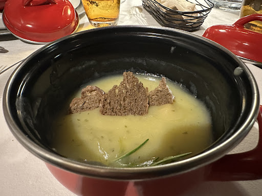 El lugar es muy bonito, las sillas poco cómodas por ser de madera (algunas sin colchón). En cuanto a la comida, el aperitivo de pan estaba bueno, nada fuera de lo común, la sopa estuvo rica, pero el platillo principal, unos camarones con verduras capeados, estuvieron muy salados, terminé optando por no comerlos… no pasa nada con todo esto, puedo esperar que no todos los platillos del menú sean buenos, lo que me dejó sin ganas de visitarlos nuevamente fue la actitud del chico de barba que nos recibió, me indicó que primero viera los precios antes de sentarme (yo caminando con una muleta por una esguince en mi tobillo), tuve que pedirle permiso para sentarme en el bar a un lado de las mesas del restaurant, cuando le indiqué que estaba bien que no había problema con los precios nos pudimos sentar en el restaurant. Lamentablemente tomé la mala decisión de quedarme a pesar de esa clara muestra de discriminación por cómo me veía, pero decidí ignorarlo porque mi pareja tenía hambre y muchos deseos de probar la comida que muchos dicen es rica en el lugar, sin embargo, por cómo podrán leer no cumplió con las expectativas, te sirven comida que se bien en las fotos, la venden con un precio alto y sabe regular o mal. Les puedo recomendar otro restaurant en Auronzo con mejor sazón, trato amable y precios acordes a lo que ofrecen, busquen Pizzeria...