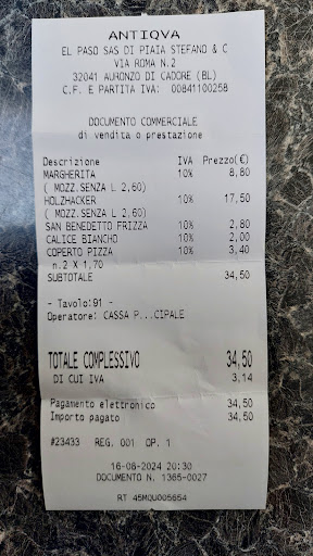 Conto totale: 1 acqua frizzante = 2.80 2 coperti = 3.40 1 pizza margherita (con mozzarella senza lattosio +2.60) = 8.80 1 pizza Holzhacker (con mozzarella senza lattosio +2.60) = 17.50 1 calice di bianco = 2.00 Totale: 34.50