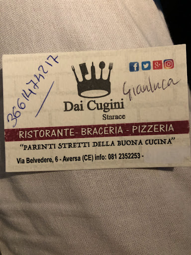 Read moreDai Cugini è innanzitutto un locale dove si sta bene: il personale e il titolare sono veramente empatici e quasi ti coccolano. Il locale, in questo periodo di chiusure dovute alla pandemia, è riuscito prepotentementebe con caparbietà a distinguersi ed essere al di sopra della media di una città ormai dedita alla ristorazione. Parlare della pizza sarebbe riduttivo e mi limito a dire che è la classica napoletana veramente buona! Ma bisogna parlare del ristorante e delle carni! Primi e secondi preparati con cura e con materie prime di qualità e la braceria è veramente top!!! Spesso (specialmente d'inverno) il locale offre musica dal vivo e spettacoli. Il menù è ampio e i prezzi sono giusti, anzi risulta economico scegliere questo locale Io ci sono stato diverse volte e tante altre...
