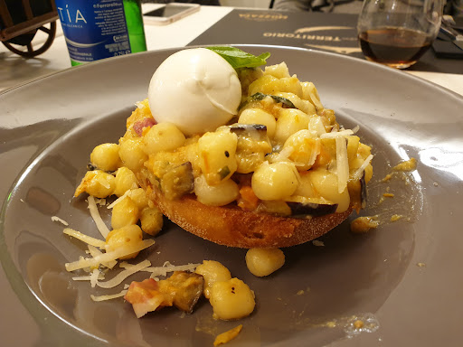 La Mozzadiavola come 2° primo e ne abbiamo presa una da dividere, qui avevo dei dubbi che sono stati confermati, il sapore è comunque buono, la pasta di mozzarella è buona e non si distoglie dalla qualità del resto dei latticini presenti nelle altre pietanze. Il sugo sopra ottimo e ricco di sapore, bene anche l'idea di inserire i crostini di pane nel cornicione così da dare spessore e formare il cornicione alto. Il problema è che il tutto non lega ed infatti il mio quesito era proprio; come possono legare? Un piatto formato da vari ingredienti, devono trovare il modo di legare bene tra di loro, in questo caso non avviene.