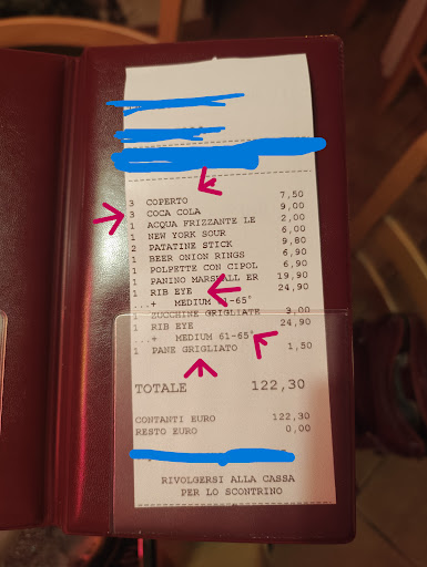 They added a 7.50€ cover charge which we were not told about beforehand. They brought bread out and then charged us 1.50€ for it without explaining that the bread was not included. We ordered 2 steaks, that we were told were 200 grams, or 7 ounces. We were told the cost of the meat was 7€ per 0.22 pounds or 3.52 ounces, so we should have been charged approx 14€ per steak. We were instead charged 25€ per steak. The coca coles were overcharged/overpriced at 3€ EACH for a small coke.