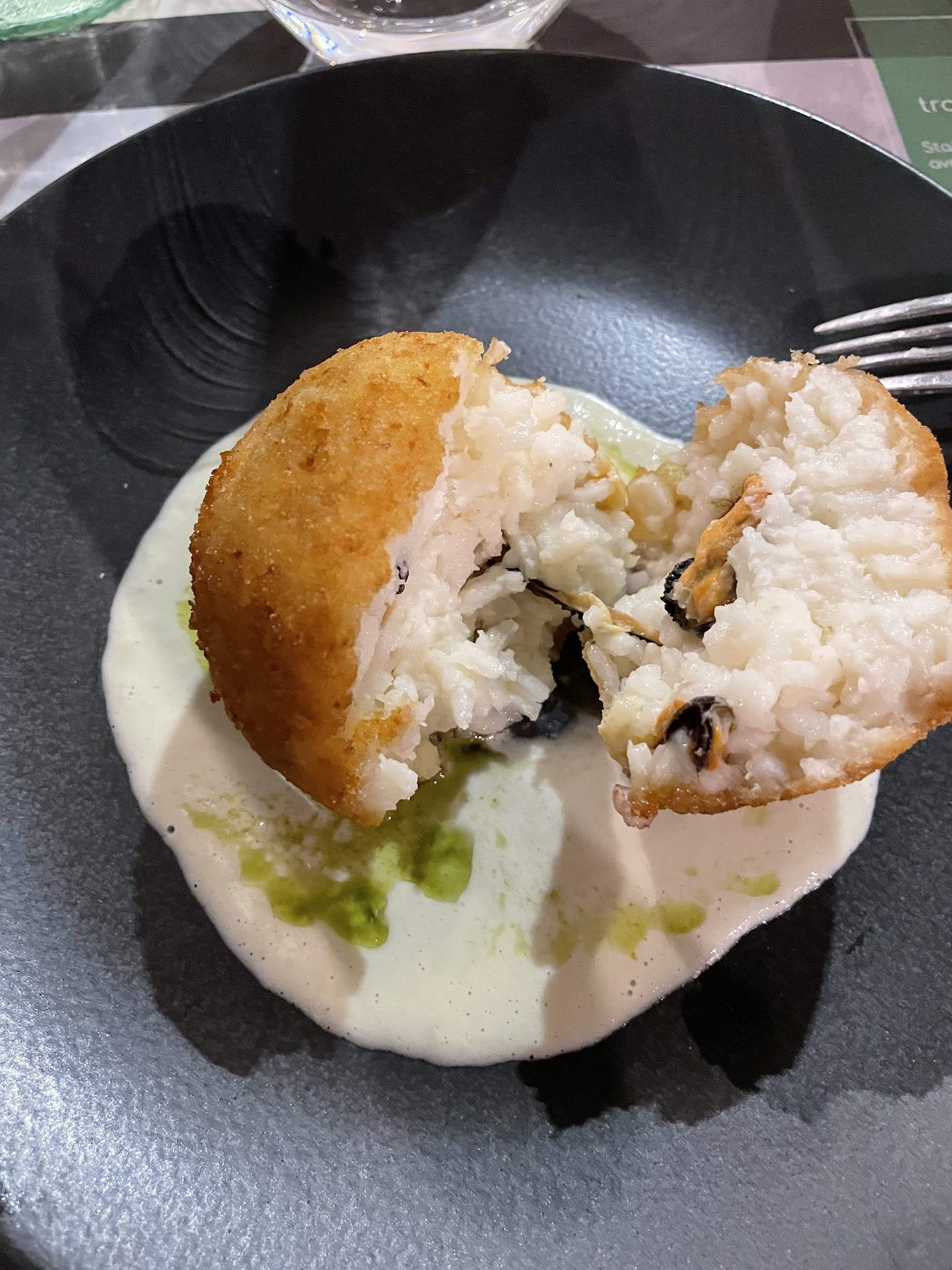 Read moreNon voglio essere cattiva, il personale era gentilissimo, ma mi piacerebbe essere d’aiuto per i posteri… se siete interessati al vostro palato leggete fino alla fine, inizierò con i “pregi”. -Partiamo dalla location: molto carina e interessante, hanno gestito bene lo spazio. -Staff: cordiali e disponibili. -Vasta varietà di vini e buoni Ok, ho finito le cose positive -Tempo di attesa: ci siamo accomodati alle 21, ci hanno portato l’antipasto 40 minuti dopo, cosa che tropo inammissibile in un ristorante con così tante buone recensioni. -Antipasti: io ho preso l’arancin* in foto, che doveva essere con le cozze all’interno e cacio e pepe. Se fate attenzione (ma anche no) si può vedere che il riso (ma anche no) che al posto di essere riso sembra più un patè, totalmente scotto e con 3/4 cozze che non sapevano di nulla, anche la frittura era fatta male, il cacio rimane pur sempre cacio ed era buono, prezzo?! Tan tan tan 9€ (un’arancin*!). Mio fratello ha preso il polpo arrosto, tre tentacoli alla modica cifra di 12€, mancava di sale, per non dire insipido. -Seguono i primi: mia madre ha preso gli spaghetti con ostriche e guanciale, un piatto stravagante che dovrebbe, “dovrebbe”, essere pieno di sapore. -Secondi: io e mio fratello abbiamo preso entrambi l’angus, beh, la carne buona, normale; MA io non pensavo fosse possibile sbagliare nel fare delle patate, per un ristorante dovrebbe essere inconcepibile sbagliare delle patate, sembravano bollite (ma uno dello staff ci ha assicurato che erano fatte al forno), così immangiabile che mia madre non è riuscita ad ingoiarla, ed ho detto tutto -Prezzo: eccessivo per tutto questo, veramente eccessivo. Mi dispiace per lo staff, ma la gentilezza...
