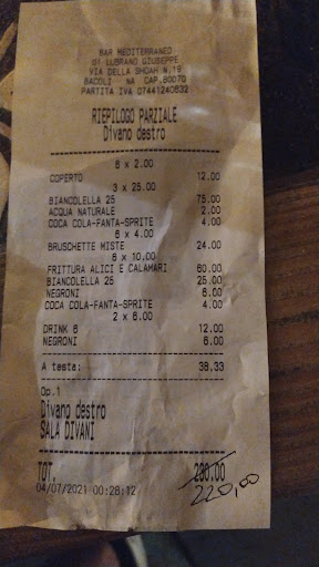 Sua altre cose potremmo sorvolare, dal biancolella a 25 euro alla coca cola in lattina 4 euro, chiedendo spiegazioni al titolare la risposta è stata che tutti pagano uguale e nessuno si lamenta, che la frittura me la faceva pagare 10 euro se volevo e mi avrebbe restituito 50 euro. Sinceramente nel presentare un conto del genere ( tra l altro barrando l'importo di 230 euro per passarlo a 220) bisognerebbe vergognarsi.