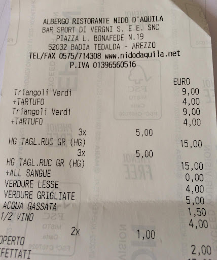 Read moreL'impatto non è dei migliori... Entrati dal lato bar(via Maggiore )la faccia e i modi della signora al banco sono quelli di chi viene scocciato e farebbe tranquillamente a meno della tua presenza e anche dei tuoi soldini. Amen!.. Abbiamo sete, e a Badia Tedalda purtroppo non ci sono alternative. Ambiente cupo...aria ferma. Le associazioni mentali mi portano dalle parti della Famiglia Addams. Visto l'orario si decide comunque ( nonostante l'"entusiasmo" generale) di pranzare. Funghi fritti buoni, tagliatelle ai porcini lisce,sottili e rapprese(lasciate le paste ai Romagnoli..) Fagioli all'uccelletto da mensa aziendale. Servizio al tavolo impersonale con cortesia finta e robotica. Divise da lavoro all-black,che con l'aquila stampata (che da nome all'esercizio) fa molto Terzo Reich. Ennó che non si...