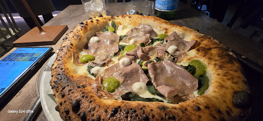 I went with the chefs recommended pizza, the Laplaca. A really different sounding pizza of Fior di latte, chard blanched in salted water and lemon, green sauce of chard, parsley and garlic, butter emulsion and anchovy sauce, beef tongue cooked at low temperature for 8 hours, "Pruneti" EVO oil.