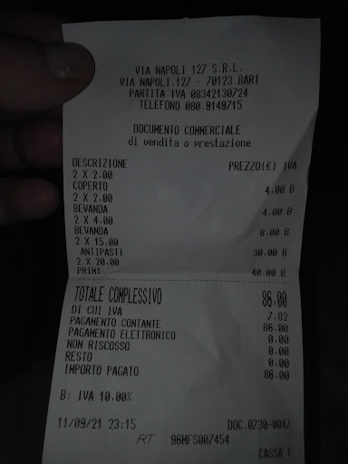 Read moreConsigliati da un amico su desiderio di frutti di mare siamo arrivati io e mia moglie in questo locale. Ordinato il desiderato crudo di mare ci arriva una sperlunga media giusta come quantità per due persone. Assaggio le ostriche: discrete ma dolci, il mare non si sentiva. Assaggio gli allievi: decenti. Assaggio i gamberi sgusciati: senza sapore con le teste completamente marce quindi di qualche giorno. Polpo insapore e non fresco (e ve lo dice chi li pesca) Voglia di crudo passata Pensiamo bene di ordinare due primi, paccheri con aragosta. Dopo un attesa infinita ci arrivano i due piatti: paccheri quasi crudi e ciliegina sulla torta pomodorini acidi. La cosa curiosa e che nell'attesa di quasi 2ore abbiamo assistito a lamentele di altri sia per l'attesa che per i prezzi. Un pizzaiolo solo non può fare pizze per tutti i tavoli e fare anche domicilio e in tutto ciò prepararsi anche i cartoni per l'asporto. Concludendo, il nostro conto: crudo di mare due primi due bottiglie di acqua e due calici di prosecco €86,00. Pazzesco Voi direte perché ho pagato? Perché non volevo infierire anch'io in quel momento,, ma comunque la mia rimostranza l'ho fatta alla signora che era alla cassa , della quale il ruolo non mi è...