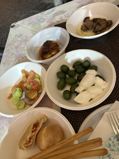 The food was even worse. The appetizers tasted like nothing, literally nothing—even the olives had no flavor. The vegetables in the salad were so soft that they seemed really old or something, One of the glasses we were given was very dirty, adding to the pleasant experience And the owner/ manager was sitting on the next table with 2 women who were clearly talking about us with bad looks and taking advantage of the fact that we didnt understand italian, but it was understandable that it was not a pleasant conversation.
