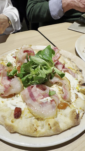 Let's start from the positive aspects: the pizza was excellent and all the ingredients of a terrific quality, but...something's still missing for a five star. Yes, it was Saturday and the place was overcrowded. Yet some more organisation at the entrance, to avoid bunches of people staying stuck inside and outside waiting to know where to go, would have helped. Too many people and lack of organisation bring to inefficient service: we staid almost 10 minutes sitting at our table waiting for someone to bring us a menu, and eventually had to stop a waiter an ask. Waiters had to snaking through the people to reach the tables and the kitchen, and too often they had to yell out to pass. And even more disappointing they yelled out one eachother while serving, joking and laughing. About food...everything was good, just the dessert a little bit under my espectations, but fine. Would I go back there again? Maybe not...