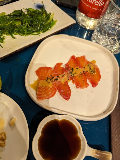 C'era una volta il Sashimi... Mi ero ripromesso di recensire la mia esperienza solo dopo averci dormito su, ma il tragitto fino a casa è stato sufficiente per convincermi oggi stesso. Non è mia abitudine recensire negativamente un locale, per una serie di motivi che si potranno leggere tra le righe, ma mio malgrado non posso attribuite più di 2 stelle a questo ristorante. Non esprimo pareri negativi per quanto riguarda la location tanto meno per la qualità di quanto consumato durante la cena, scendere nei dettagli renderebbe poco credibile la recensione. Una volta arrivati siamo stati accolti da colui che non so se fosse il ”maitre" o comunque uno chef de rang che una volta accompagnati al tavolo ci ha indicato il funzionamento del servizio e ci ha attaccato un post-it sul tavolo in modo da potervi indicare sopra quanto desiderato, sottolineo che nessuna nota di demerito è stata attribuita a causa del post-it che ha svolto egregiamente il suo lavoro accompagnata dalla penna che non è stata da meno, una volta ritirata l'ordinazione salutammo per sempre il possessore colui che del rango vi era il responsabile. Vi era più di qualche dipendente che evidentemente possiede ancora poca esperienza, al quale non faccio nessuna colpa, perché malgrado mi sia stato portato un calice di vino anziché 2, diverso da quello ordinato, che mi sia stato fatto versare da solo, quindi mi è stato lasciato sul tavolo un fondo di bottiglia sufficiente per neanche uno dei 2 calici richiesti e l'altro arrivato dopo averlo chiesto nuovamente ovviamente sul conto ne risultavano 3 ma lì ci arriveremo, nessuno di questi ragazzi ha colpa, perché essere alle prime armi non è una pecca di un ristorante non avere personale esperto non è un demerito per un locale ma avere personale inesperto e non guidarlo durante il servizio, li sta la mancanza, chi coordina la brigata? Dov'è il responsabile di sala? Come puoi non accorgerti che lo staff ha bisogno di essere diretto e coordinato che magari un sottoposto ha bisogno di un consiglio su come ricordare i tavoli a cui deve portare qualcosa o magari uno dei tuoi colleghi ha bisogno di un consiglio su come tenere il vassoio quando si sparecchia per lavorare meglio e senza paura che gli cada qualcosa? Questa è uno dei motivi per il quale non posso dare più di 2 stelle a questo locale, o anche perché siamo entrati alle 20:40 e siamo usciti alle 22:47 e nessuno si è accorto che in quelle 2 ore in cui ho notato tutte queste cose, per la maggior parte del tempo eravamo in attesa del Sashimi che non è mai giunto a destinazione e per l'altra parte eravamo intenti a fermare qualcuno per chiedere informazioni riguardo al Sashimi scomparso, ma siccome richiamare l'attenzione di un cameriere è stato più complicato che farci passare l'appetito abbiamo rinunciato a quest'ultimo dirigendoci in cassa dove sul conto vi era anche il famoso calice di vino sopra citato, e fatto notare l'errore, chi era alla cassa, quasi imbronciato, ha corretto l'errore riprendendosi lo scontrino che non ha più riconsegnato. Se per caso questa recensione dovesse essere letta da qualcuno dei dipendenti che si rivende in quello che ho riportato nella recensione ci tengo a sottolineare che le vostre non sono delle mancanze, l'inesperienza non è difetto ma un punto di partenza, sarei ipocrita se dopo sette anni di sala pensassi una cosa...