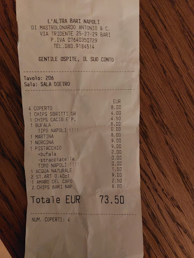 In conclusione, “L’altra Bari Napoli” è il locale dal perfetto mix di qualità, eccellenza e professionalità. Dalla qualità straordinaria delle materie prime alla maestria nella preparazione dei piatti, dalla velocità del servizio all’accoglienza calorosa del personale, ogni elemento contribuisce a creare un’esperienza culinaria che va ben oltre le aspettative. Se si è alla ricerca di un ristorante dove la qualità è sempre al primo posto e dove si può contare su un servizio di altissimo livello, “L’altra Bari Napoli” è senza dubbio una scelta che non deluderà. Una vera eccellenza nel mondo della ristorazione, capace di trasformare una semplice cena in un’esperienza da ricordare e consigliare a chiunque ami la...