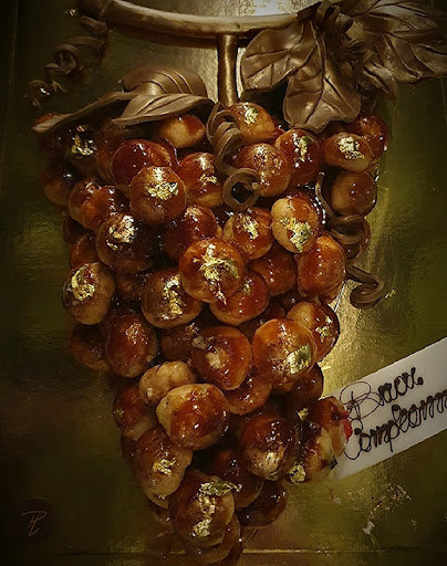 Read moreQuando un'opera viene riconosciuta "OPERA D'ARTE"? Quando l'artista esprime con il massimo talento, la semplicità. Questa foto rappresenta un' OPERA D'ARTE realizzata dalle mani esperte di un grande pasticciere barese (ovvero la sua pasticceria dove realizza opere d'arte è a Bari) il grande Pino Ladisa. Questa opera realizzata dal Maestro Pino Ladisa (che conoscevo solo di fama) è il risultato di uno scambio telefonico nel quale abbiamo definito come l'opera dovesse essere opportunamente creata. L'idea originaria era molto semplice: un "presente" ad un caro amico nel giorno del suo compleanno. Siamo un gruppo, direi corposo, di amici che hanno frequentato il mitico "Vivante" negli anni settanta e che, nonostante il tempo abbia modificato i ragazzi e le ragazze di allora, siamo ancora quei ragazzi e quelle ragazze degli anni settanta. Bene .. un presente per il ns. caro amico, imprenditore nel campo vitivinicolo, che possa stupirlo. Cosa meglio poteva rappresentarlo se non un grappolo d'uva??? Bene a chi rivolgersi..alla migliore pasticceria esattamente Pino Ladisa Pasticcere Cioccolatiere. Che aggiungere, il risultato è in questa foto, 110 bignè ripieni.... super ripieni di ottime e variegate creme, bignè che hanno sapientemente formato un grappolo d'uva. Gli acini magistralmente ricoperti da un sottilissimo strato di zucchero caramellato che ha quasi incollato gli acini per rendere il grappolo maestoso ma semplice. Ogni acino era un'esplosione di gusto che il sottile strato di zucchero caramellato custodiva. Mi ha detto il Maestro Pino Ladisa quando sono andata a ritirarla "di questa torta non si butta nulla se non il vassoio". Bene in 15 minuti 22 persone hanno esattamente fatto questo prendendo "spiluccando!" con le mani acino dopo acino fino a lasciare un'ombra sul vassoio...