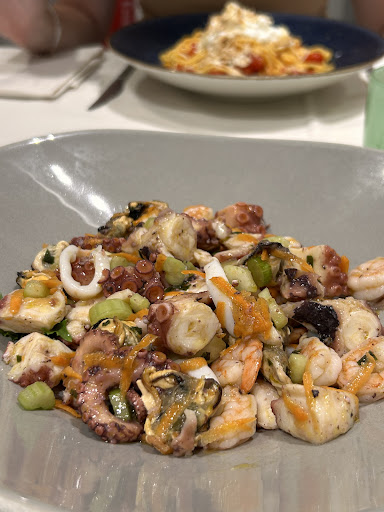 Read moreNon male, siamo stati invitati qui per una festa di laurea, il festeggiato aveva deciso per il menù fisso a €50, che comprendeva antipasti misti al centro (non male come gusto, erano abbondanti), un primo a scelta tra 2 che erano paccheri al sugo di cernia e pasta con gamberi e pistacchio (quest'ultimo l'avevo scelto io ed era un po' insipido, poi l'ho scambiato con mia madre ed era più buono il sugo di cernia in effetti), un secondo a scelta tra la frittura di calamari (centrale, era abbondante) e la tagliata di carne (a persona), poi sorbetto, poi frutta centrale con 1 pezzo contato a persona (c'erano pezzi di anguria, ananas, melone arancione e melone bianco), poi anche dei dolcetti centrali abbastanza buoni (tra cui babà, sospiri, code di rospo e simili, sempre uno per uno nel piatto, noi eravamo 8 ed erano sempre 8 contati), poi i liquori a scelta e il caffè per chi lo voleva, tutto questo nel menù a €50, devo dire che era parecchia roba per il prezzo, io già dopo gli antipasti ero sazia, da quello che ci hanno detto anche le bevande erano comprese nel menù a €50 e devo dire che erano parecchie perché essendo estate abbiamo ordinato molte bottiglie d'acqua, 2 bevande, 2 bottiglie di vino e anche lo champagne finale, non so se lo champagne e il vino fossero compresi ma in ogni caso era parecchia roba per €50, i camerieri sono stati abbastanza gentili, da quello che so fanno anche le pizze di sera e il menù alla carta, lo consiglio, senza infamia e senza lode, a me non hanno fatto impazzire i due primi e il fatto che ci fosse poca scelta ma immagino che alla...