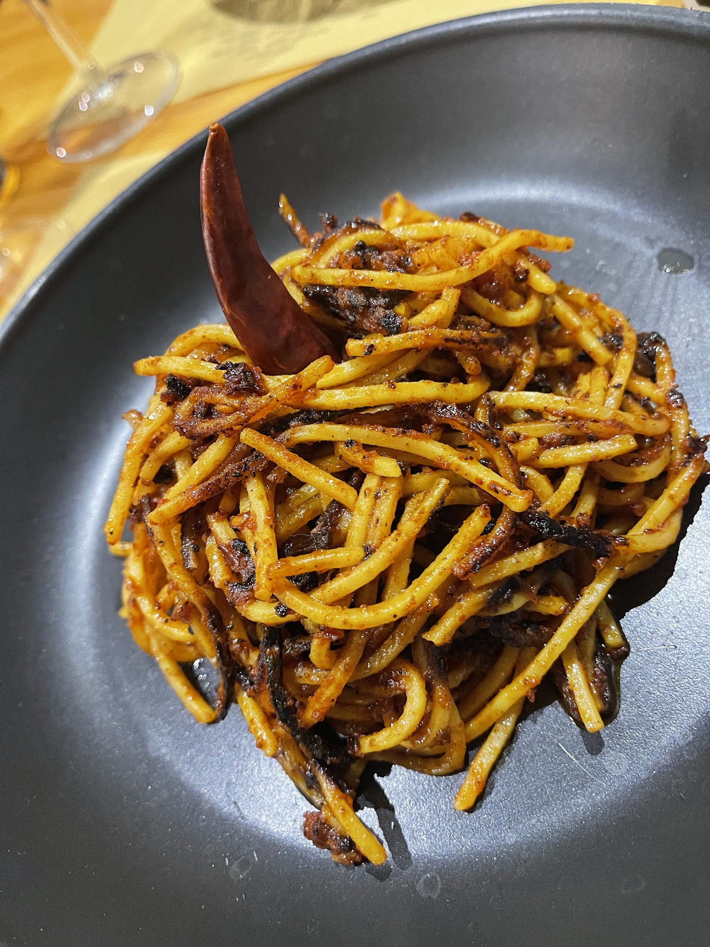 The spaghetti all’assassina prepared by Antonio is a marvel of simplicity and depth of flavor. The spaghetti is perfectly cooked and ‘burned’ directly in a vibrant spicy tomato sauce and it becomes crispy and al dente. And you wouldn’t know the unique way it’s prepared from the simple name on the menu, it also happens to be naturally vegan.