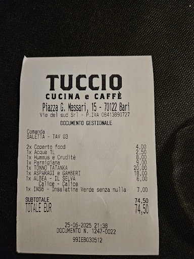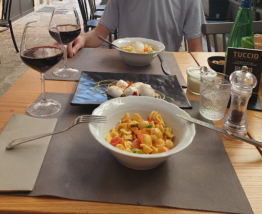 Read moreWe have recently visited Tuccio e café, and it was awesome! After having visited multiple locations and villages with mountains of options to dine at, we stumbled across Tuccio on our last night in Bari. We wanted our last night to end with a bang, and Tuccio delivered. Upon entering the restaurant, we were greeted by a very kind staff member who, right away, had us sitting in a cute outdoor-type dining area; which, in my opinion, really brought an amazing feel and atmosphere to our dining experience. Once we were seated, our hostess quickly brought us some fresh natural water and some complimentary snacks - which were scrumptious, might I add.