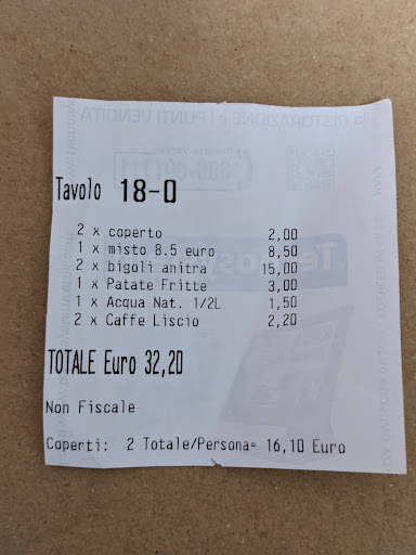 Mai più! Abbiamo chiamato la mattina per prenotare a pranzo e, dopo essere stati accolti con un "non abbiamo segnato la prenotazione ma non c'è nessun problema" ci sediamo in terrazza e ordiniamo i piatti. Antipasto discreto ma senza fama ne gloria. Arrivano poi i due piatti di bigoli all'anatra e dopo la prima forchettata entrambi ci lamentiamo per il piatto troppo salato: beviamo dell'acqua, proviamo a mangiare nuovamente ma il sale è talmente tanto che è impossibile continuare. Avvisiamo il cameriere del problema e rifiutiamo il suo invito di ordinare nuovamente il piatto perché il precedente ci aveva già stomacato con soli tre assaggi. Poco dopo si avvicina il cuoco (che presumo essere anche il proprietario) che, rinnovando l'offerta di prepararci un altro piatto, ci dice che ha assaggiato personalmente il cibo e che non è affatto salato ma probabilmente noi non siamo abituate a mangiare piatti fatti così. Premettendo che effettivamente noi non abbiamo mai mangiato bigoli al sale, non mi sarei lamentata se sul listino fosse riportato esattamente questo nome ma, dal momento che ho mangiato più volte i bigoli all'anatra, posso sicuramente confermare che il "gusto" non era minimamente associabile al nome del piatto. Come potete immaginare il dialogo serviva solo per giustificare il conto che ovviamente presenta i due primi piatti: speriamo che i 15€ di bigoli (non mangiat)i siano stati conteggiati come offerta per sostenere il settore della ristorazione che in questo periodo sta soffrendo molto. Diversamente, non ci sarebbe stato motivo di aggiungerli al conto e questo il proprietario lo sa perfettamente perché lui stesso non avrebbe mai finito un piatto così ne l'avrebbe pagato: ognuno ha i propri gusti ma nessuno berrebbe mai l'acqua del mare per dissetarsi! Può succedere a tutti di sbagliare a salate l'acqua ma non avrei scritto questa recensione se ci fossero state delle scuse sincere e un...