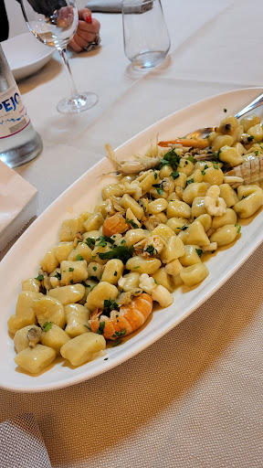 Read moreAntipasti caldi e freddi di pesce nella media, senza lode né infamia,. Due alici di numero e quattro cannolicchi con un po' di pane grattato. Porzioni piccole, avevamo ordinato un antipasto di pesce sia caldo che freddo per quattro persone ed è arrivato uno che si è no bastava per due. Antipasto di pesce passabile come anche gli spaghetti, lime e scampi. Gli scampi erano grandi e buoni gli spaghetti però quasi scotti. Gli gnocchi ai frutti di mare si vedeva che erano precotti ma passabili anche questi diciamo. La cosa positiva è stata la tagliata di manzo, buona, (un po' troppo salata 🤤) ma il taglio di carne era fresco 👍 Anche il contorno ascolano (patatine fritte, creme fritte e olive all'ascolana) non è stato male, solo (e ripeto come come detto all'inizio) porzioni piccole. Per il resto personale educato, simpatico e molto alla mano per qualsiasi nostra richiesta. Location ben tenuta e curata con apio parcheggio all'esterno. Prezzo un po' alto a testa per quattro persone anche se il menù era per la maggior parte di pesce e si sa....se prendi il pesce, vai anche su di prezzo....ma non così tanto. Comunque se ci ritornerei ? Forse si....e diciamo più che per la cucina, solo per la simpatia dei camerieri e del...