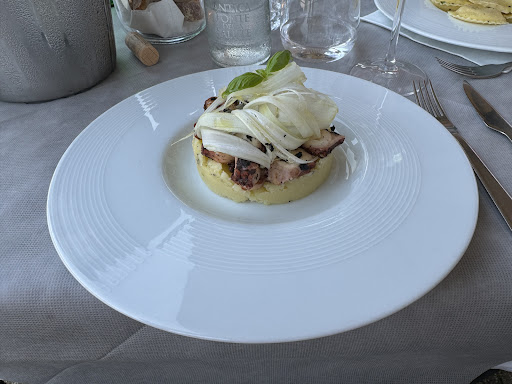 Very characteristic restaurant facing the lake. We stopped here by combination (we found parking for the car) and, upon entering the restaurant, they diverted us to the outdoor tables facing the lake. Enviable and relaxing position. The mise en place is treated with fabric tablecloths. The wine glasses were adequate. Nice presentation of the dishes, but also of the bread. We chose the crispy octopus as an appetizer, served with mashed potatoes and black olive and celery powder. My host chose the marinated trout tartare with soy sauce and ginger, served with lime mayonnaise. Being a warm evening, we skipped the first course to enjoy a main course: for me Amberjack cooked on the skin served with daikon cream and black lumpfish roe. My host instead chose the Sea bass fillet, baked in the oven, served with carrot puree and sauteed spinach. To water the dinner we opted for a local wine; a Sparkling Cocchi brut Charmat method ... excellent choice for the evening. To finish the soft dessert with ice cream and for me an Amaro di Angera. Coffee. All for 120 €, an average price. The only drawback: if you decide for the view during dinner, bring a good supply of anti mosquito spray! Fortunately, the very kind staff provided us with a package that we used and passed on to the neighbors. We will be back ... maybe not on a very...