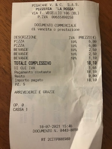 Probably most of their customers stop by there are not locals... (or maybe tourists are charged different price??) I went there with my boyfriend to eat pizza but unfortunately pizza was not available because it was 3 O'clock and lunch time was finished. So instead we ordered very simple 2 panini, 2 cans of coke (not cold, without ice) and 1 espresso. We were feeling awkward since there were no menus available, one lady there asked what panino we would like and took our order. Maybe it was our mistake not to ask for a menu or the price, but two panini and 2 cokes ended up with 18 euros did not make us happy at all... Somehow, the receipt says 2 pizzas, when we ordered...