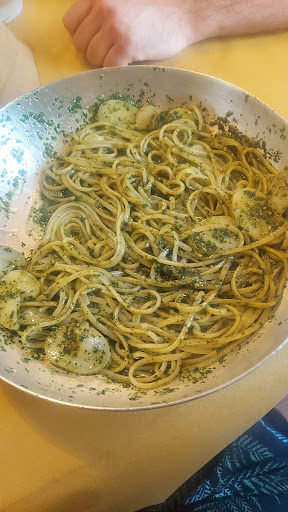 Read moreSe non si prenota non si entra. Pasta buona e abbondante servita in padella, molto originale, tanti tipi di pasta e svariati condimenti.... Forse troppi.... la padella è grande e sul tavolo se si è in tanti non si sa dove mettere il manico troppo lungo. Prezzi nella norma vista la quantità di cibo. (se non avete tanta fame una padella basta per due persone). Non consiglio altro, ho visto insalate e toast, ma quelli ce li possiamo fare a casa. Locale come un corridoio. Lungo e stretto... Troppo stretto... Con un enorme calorifero dietro la schiena e mensole inutili, piene di vecchi giornali pieni di polvere che potrebbero essere buttati via. Abbiamo mangiato davanti alla cassa che è in mezzo al locale, (sarebbe meglio metterla davanti alla porta) il via vai di chi doveva pagare (perché non portano il conto al tavolo) è veramente fastidioso. Tavoli troppo grandi e troppo lunghi, con una panca lunghissima, per il posto in cui si trovano. Tanti tavolini più piccoli sarebbero molto molto meglio. Ci hanno detto che nel 2018 il locale verrà ampliato... Speriamo in un bel restyling. Non c'è privacy perché alla fine mangi sullo stesso tavolo con altre persone. Essendo stretto il locale c'è il rischio che la cameriera passando ti rovesci del cibo in testa. Ci sono solo 2 cameriere, troppo indaffarate, una è stata gentile, ma poco attenta... Ti offrono un aperitivo alcolico, ma quando gli ho detto che ero astemia a me non hanno portato nulla... E guardare gli altri bere non è carino (non avete aperitivi analcolici?). I cani possono entrare e vengono serviti subito con acqua e crocchette, può essere una cosa buona se il posto fosse grande, ma anche no... così ti trovi a mangiare con i cani seduti accanto, lo trovo veramente poco igienico... (noi ne avevamo 2 seduti vicino ...non nostri, ma di persone sconosciute, per fortuna educati e silenziosi). Poi ne sono entrati altri, se tutti entrassimo con uno o più cani sarebbe un caos. Buono il tiramisù anche se troppo freddo. Non ci sono finestre e alla fine esci che puzzi di cibo e di cane. Vestiti buttati subito in lavatrice una volta a casa e doccia d'obbligo. Parcheggio...