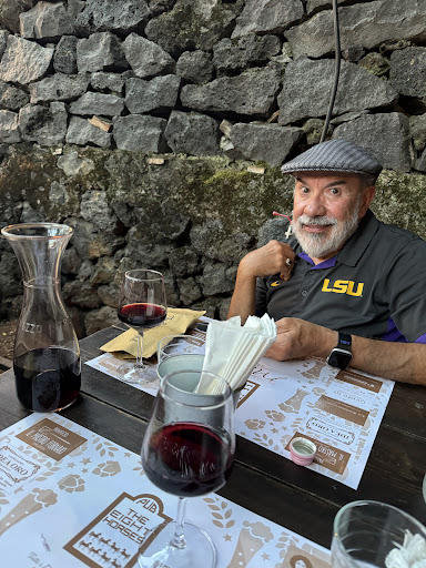 At first glance inside was dark and gloomy. Only a few customers were there, but we were delighted when they led us out to their garden patio with lots of seating. A band was setting up for a live session and we settled in with a 1/2 liter of red wine to enjoy the ambiance. The house specialty is horse meat, which both love, so we ordered horse meatballs with boiled potatoes and a horse meat pizza- both were beyond fantastic! Very tender and flavorful indeed! We enjoyed another 1/2 liter of wine and finished our evening by sharing a lemon granita. By this time the twinkling lights were on, the tables were filled with customers and we were enjoying the delightful singer and band! It was a great evening with great prices and staff that can speak...