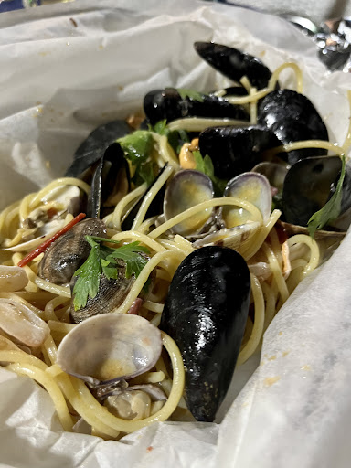 Cena di 15 persone in cui alcuni hanno preso pizza altri primi o pesce, io ho preso un piatto che doveva essere pasta fresca allo scoglio ma è stato tutt’altro, questi i punti critici: porzione esigua in corrispondenza del costo (15 euro per due forchettate di pasta sono eccessive) -la pasta era troppo cotta, infatti si rompeva e in bocca non aveva consistenza, risultando pessima. -il sughetto era insipido, non sapeva ne di pesce ne di nulla, era un po’ di sugo con olio insapore. -il pesce non era assolutamente fresco, qualità scadente e anche questo dal sapore sgradevole. Poi al tavolo è stata ordinata anche una tagliata di tonno scottata che di tagliata aveva ben poco, spessore di una bistecchina( se questa è una tagliata allora la Fiorentina è un animale intero) e poi la cottura era anche qua eccessiva, nonostante fosse stato chiesto esplicitamente al cameriere di farla quasi cruda, cioè solo cotta appena appena, il quale ha risposto in tono sgarbato che scottata vuol dire quello… Ulteriore disguido che nei bagni non funzionava nemmeno l’acqua… se questo si chiama servizio… Sono rimasto assolutamente deluso da questo posto e consiglio di non andarci. Anche le pizze eccessivamente costose e dall’aspetto poco invitante. Ultima nota dolente i dolci, come il tiramisù che è quello confezionato Sammontana venduto alla modica cifra di 6 euro, mentre il tartufo di pizzo, anche esso confezionato, a...