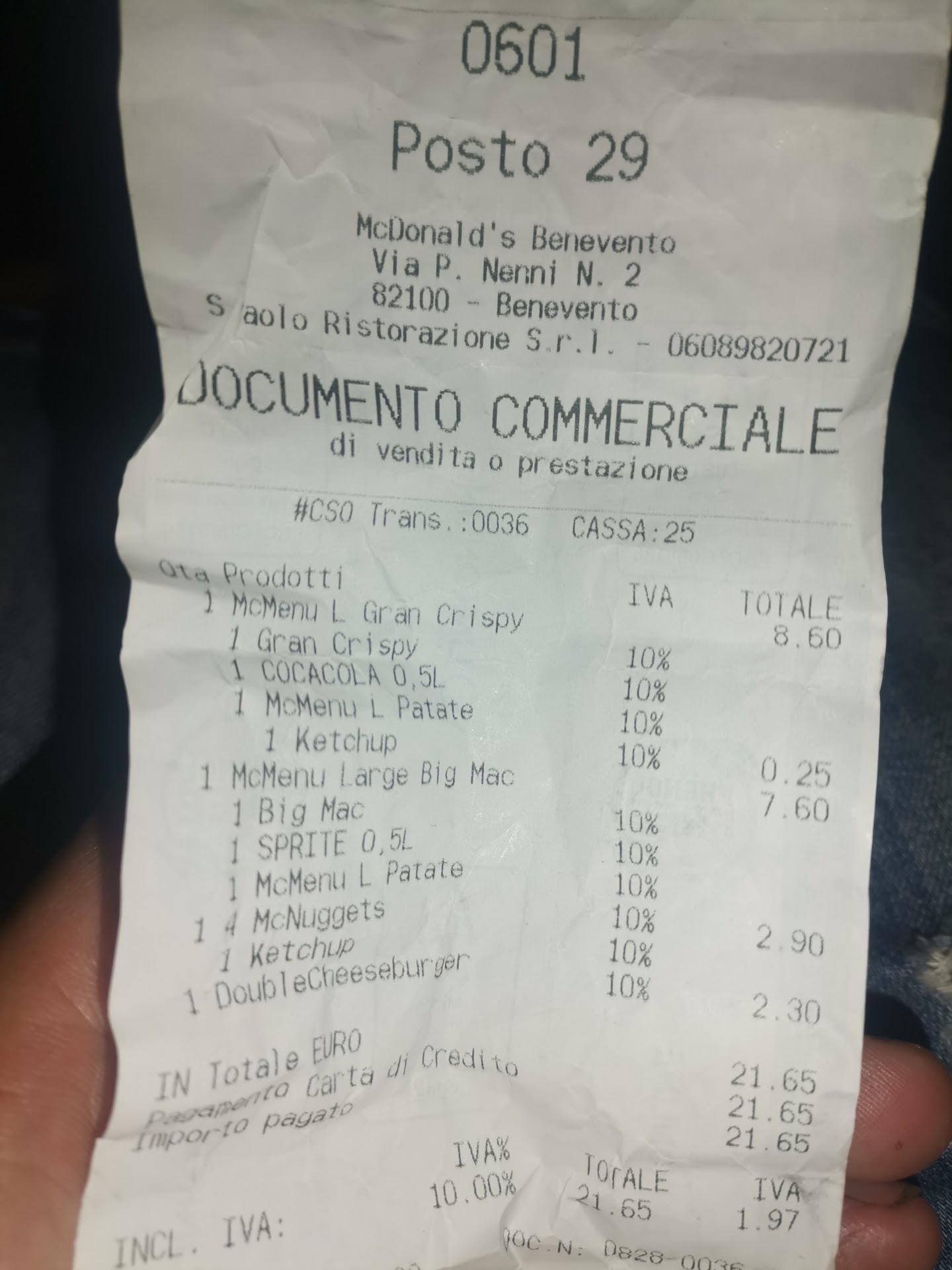 11 MAGGIO 2022 McDonald's Benevento, un crollo di una così grande azienda come Mcdonald's, non lo so chi stia gestendo questo punto vendita ma davvero pessimo, una terremotata vicino alla cassa, pochissima gente e dopo 10 minuti ancora non venivamo serviti, vado per chiederle il mio ordine a che stava e mi risponde in maniera infastidita, mai vista tanta incompetenza e disordine, poi un gruppo di persone che stavano la dentro senza consumare a dare fastidio, non mi sembra di essere andato al McDonald's. Sconvolto. Quasi sicuramente non ci andrò più, mai ho avuto un esperienza così pessima, avranno cambiato direttrice, perché con quelli che ci stavano prima era tutto ottimo, seguivano alla perfezione la linea McDonald's, invece ora mi sembra di andare a mangiare un hamburger in qualche hamburgeria di ratti. Le patate secche, un mal di pancia, mai assaggiato un Big Mac così schifoso( mangio il Big Mac da più di 15 anni).