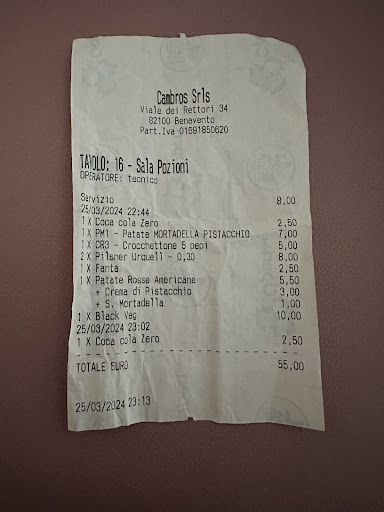 Infine: quando sono arrivata in cassa ho lasciato appositamente il preconto con il totale della cena e Lei, dopo aver contato che il denaro fosse giusto mi ha rimesso il preconto davanti, io l’ho ripreso per assicurarmi che fosse solo un preconto e ho aspettato per vedere se venisse stampata la ricevuta fiscale, ma questo non è accaduto. Neanche nel mentre che ci siamo diretti verso la porta, quando Lei anziché pensare a stampare immediatamente lo scontrino, guardava verso il basso nella cassa. Non cerchiamo di giustificare l’ingiustificabile, la ricevuta fiscale va stampata immediatamente appena incassato il denaro e il tempo per stamparla con noi lo ha avuto, ma non lo ha fatto. Si ricordi che non sa mai chi ha davanti, anche se vi sembrano forse solo dei ragazzi. Buona giornata.