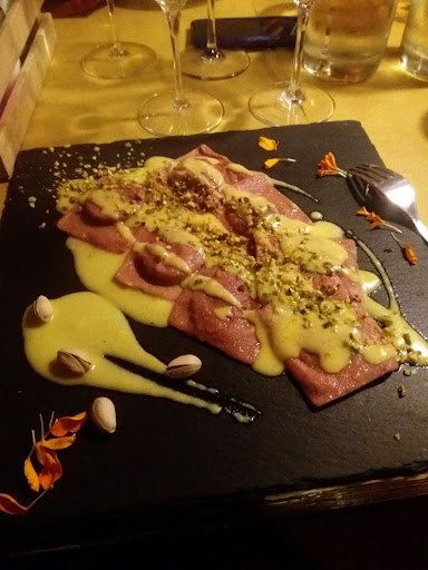 Read moreSono stato all'Osteria Bacco Matto per una cena di coppia, ho subito apprezzato il locale con un buffet di formaggi e un'ottima esposizione di vini in bella vista. Siamo stati accolti con un piccolo aperitivo a base di una buona tartare di manzo ed un calice di vino bianco compresi nel coperto. Molto buono anche il pane portato a tavola con del fantastico olio del Lago di Garda. Al momento di ordinare, abbiamo avuto ottimi consigli per quanto riguarda i vini da parte dello staff di sala che, non solo ci ha fatto assaggiare tra diverse tipologie di vino, ma ci ha anche guidato verso il giusto abbinamento a seconda del piatto ordinato e dei gusti personali. Abbiamo ordinato una costata di angus australiano disossata da oltre 650 grammi, un controfiletto di puledro con riduzione di Lambrusco e polenta taragna ed una patata con formaggi d'alpeggio e guanciale croccante. La carne era molto saporita e cotta al punto giusto, eccezionale anche la patata e davvero eccellente il dolce, una cheesecake al mango con riduzione di lamponi che era stata appena aggiunta al menù, che abbiamo avuto il piacere di poter assaggiare per la prima volta. La consiglio davvero a tutti, specie se abbinata ad un buon bicchiere di vino passito (abbiamo scelto per un Moscato di Pantelleria). Curato particolarmente anche il caffè, servito con dei biscotti ed alcune caramelle. In totale abbiamo speso 90 Euro, prezzo secondo me giusto avendo preso 650 grammi di costata di angus (che da sola è la metà del conto), un controfiletto, un contorno, due bottiglie di acqua, tre calici di vino, dolce e caffè. Il coperto costa €2,50 ma è ampiamente giustificato dall'aperitivo e dalla qualità del servizio. Tornerò...