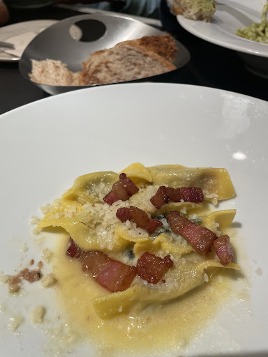 By chance I saw this fancy looking cafe/patisserie offered a lunch menu. Went in to check the prices and found a very affordable weekday lunch deal. We were 4 adults and ended up sharing 2 x lunch deals which gave us 4 primi dishes, 2 cakes, 2 waters 250ml, and 2 espressos for the very reasonable price of €44. No coperto but they still gave us a generous portion of bread. The table service was top notch, and the interior decor was beautiful, dining room was quiet tucked away at the back far from the busy street. Food was excellent; meatballs and polenta was creamy and flavorful, casoncelli and trofie al pesto pastas were delicious. Admittedly the size of the primi dishes are not massive, someone with a big appetite might want the €22 deal for just one person, but this was adequate for us, especially with the addition of the bread and dessert. For dessert you got to choose from a selection of tea cakes in the middle table; the pistachio strawberry was top notch. This special menu pricing was not advertised anywhere outside the cafe so I am very glad I went...