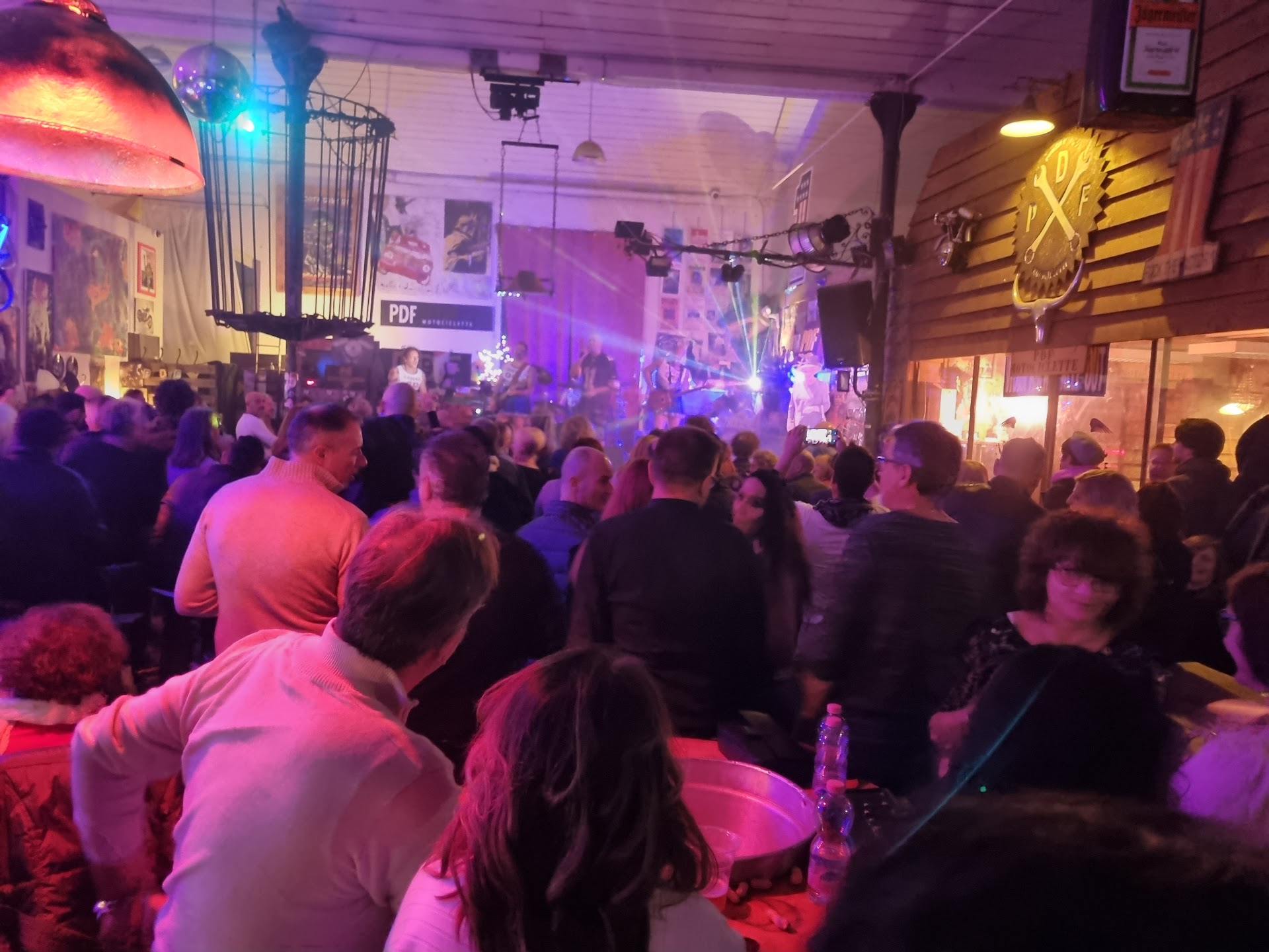 Avete presente le discoteche, la fila fuori, tutti belli tirati e pronti a tutto pur di apparire? Niente di tutto questo. La gente arriva tranquilla e serena, esibisce la tessera club (10 euro una tantum) e se ne entra tranquillamente in questo locale rustico e ruspante. Tutto quello che si vede, che si nota, è la gente che si diverte in modo normale, naturale. Certo, c'è un bar e sei libero di bere, cone senpre. Ma non ho visto niente, na proprio niente, che assomigli a qualche sostanza... Interessante invece lo sviluppo delle situazioni, in bilico tra qualche ragazza che balla sui tavoli, e la 'gabbia', che ovviamente lascia trasparire una qualche pretesa di trasgressione... Insomma, posto pieno al 100%, tutti-ma-proprio-tutti che ballano (o ci provano), nessuna situazione a rischio se non il voltaren il giorno dopo... vista l'età media degli astanti: qualche presenza ventenne, discreta partecipazione dei trentenni, ma la voce grossa è dei quarantenni e oltre. Emozione, divertimento,...