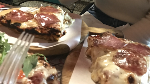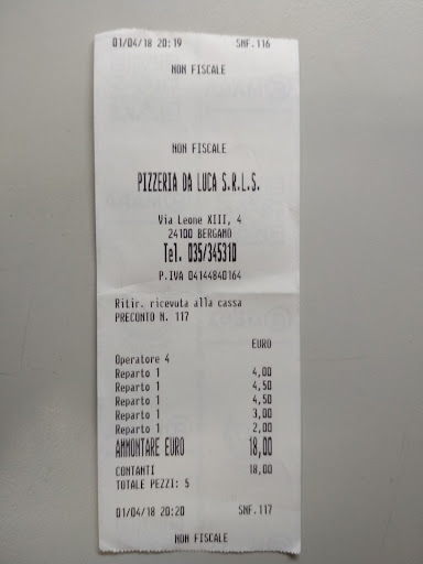 SI NO HAS VENIDO, AÚN NO SABES QUÉ ES UNA PIZZA MASA PAN. Nos alojamos en Bergamo como última noche de nuestro viaje, saturados de pasta y Pizzas...pero NO, ésta última vez resultó ser la mejor de todas!!! si crees que has probado una pizza "masa pan" buena es que NO HAS ESTADO EN ESTA PIZZERIA!! hay un antes y un después de probar su pizza y no exagero!! Fuimos a Pizzaria Da Luca por las recomendaciones y la verdad es que es un acierto 100%. He leido algunas críticas del tiempo que tardan, si es verdad que sobre las 20-20:30 es hora punta, y ves un reguero de gente continuo que viene a recoger sus pizzas mientras tu esperas a que te sirvan la tuya (además el local es pequeño, está pensado más para llevar que para tomar allí), sim embargo, Luca nos dijo que tardaría 15 minutos y tardó 18, así que la espera es una espera muy llevadera, puedes entretenerte solo viendo a los trabajadores y las trabajadoras con una sincronización y un ritmo endiablados, además de la maestría de Luca con el horno. A destacar: trato buenísimo, en un ambiente muy relajado te tomarás una pizza simplemente DE ESCÁNDALO. Las pizzas van por porciones, y siguiendo una recomendación nos pedimos tres porciones para mi mujer y para mí, aún así, Luca nos regalo una cuarta porción, de manera que estábamos a dos por cabeza (mira la foto), pues bien...casi no podemos ni acabarlas!! las raciones son brutales, así que probablemente (y yo soy un buen buen comedor) 3 raciones sea el tope máximo para dos personas, de ahí en adelante es "mucho decir" y de verdad. La pizza...BRUTAL, solo recuerdo dos de las 4 que pedimos, la de Salami Picante, un acierto si te va el picante, y la Forza Italia (en la foto la que lleva un montón de rúcula) y estaba DE MIEDO!! además, Luca nos aconsejó una de las porciones (la de la foto con la mano) que estaba de escándalo...Otro y muy importante factor a favor es que, por una vez en un restaurante en Italia, no nos sablaron con la bebida, cerveza local (Moretti) de 66cl!!!! por 3€ y fanta de 50cl por 2€ (mira la foto), por fin!!!! Así que, la cuenta, teniendo en cuenta la porción que nos regaló Luca (y que no era necesario para saciarse ni mucho menos) la cuenta se quedó en unos comodísimos 18€ (mira la foto), de lo más barato en todo el viaje. En resumen: No se si será la mejor Pizzeria de todo Bergamo o no...pero lo que si sé es que será si no la mejor, de las mejores en las que comas en todo tu viaje a Italia, por un precio pequeñísimo y un ambiente estupendo. Sin duda, para repetir y repetir...