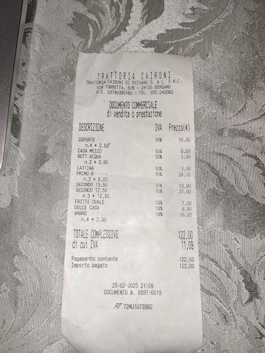 Read moreCi siamo recati in questo locale per un'occasione e abbiamo deciso di portare una torta da una pasticceria rinomata a Bergamo. Come siamo entrati siamo stati accolti da un cameriere (spero non il direttore) del locale che in maniera molto burbera ci ha indicato il nostro posto sottolineando che entro un ora avremmo dovuto liberare il tavolo (nonostante avessimo prenotato già dal pomeriggio). Lo stesso dopo averci fatto accomodare ha preso la torta dicendo che se ne sarebbe occupato lui (assieme alla torta è stato consegnato scontrino fiscale come detta la legge italiana), ha posizionato la torta SOPRA e non DENTRO un frigorifero all'ingresso del locale innalzando anche della polvere.. quindi visibile a tutti ma figuriamoci se fosse passato un controllo per l'HACCP... I piatti nel complesso nulla di spettacolare come leggo qui dalle recensioni ma comunque buoni, siamo inoltre stati accolti in maniera molto educata dalle due cameriere. Giunti alla torta il cameriere che ci ha servito quasi tutta la serata sempre con il broncio ci ha lasciato (per non dire lanciato) la torta sul tavolo senza rispettare la nostra richiesta di mettere le candeline sopra. Infine sullo scontrino fiscale appare una voce "dolce casa" dove effettivamente il dolce veniva proprio dalla mia di casa... Sostanzialmente per ogni persona presente al tavolo è stata applicato 1,50 euro per un totale di 6 euro che successivamente ci ha spiegato era il "servizio torta" anche se a me è sembrato più LA SOLA AL CLIENTE visto che non esisteva alcun servizio . Andateci pure ve lo consiglio per farvi...