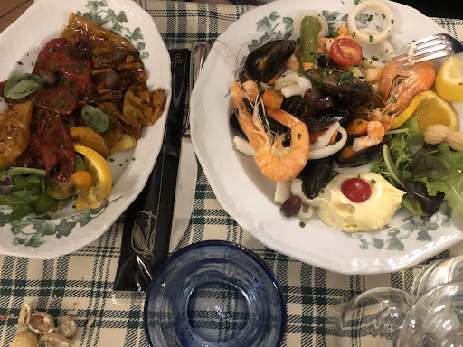 We arrived at the restaurant without a reservation at lunch and because we are tourists they immediately gave us the menus instead of allowing us to eat what the regular Italians were eating “menu of the day”. Because the prices are moderate, we decided to try diverse things. For the beginning we took water, house wine and those were fine. Then my first course was the cold fish platter which was decent, my friend’s food was the polenta with the sausage and bacon. Extremely little sausage meat with hard texture, lots and lots of polenta and sage. At this point my friend wants to leave, but I insist giving them a second chance. Second course, we order the most expensive dish- fillet steak with french fries. The steak was under 100 grams cooked, full of fat and cartilages. Disgusting. French fries from the freezing section. My meal was a bergamashi stew and it had no flavor, it was almost sour. The meat was sliced extremely thin but what was disgusting is the fact that you could see the cartilages, chewy and disgusting. Just the worst quality of meat you can ever imagine. This was around 70€ on 18-10-2024. Staff is friendly, atmosphere is ok, but the quality of the food is bad and it became a tourist trap. Ate a loooot better în many...
