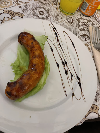 Arrivato l‘antipasto che sembrava un piatto mangiabile, ma era tutt’altro. Tutto il piatto inzuppato di aceto. Quindi salume ecc tutto pieno di aceto. Nel frattempo arrivato anche i piatti di pasta. Oltre a diversi piatti era stato ordinato un piatto di pasta con le verdure. (Le verdure purtroppo lì andavi a cercare, perché nel piatto non ce n’erano o diciamo pochissimo) per 10€ Di sapore bisogna essere onesti era buono. Dopo la pasta arrivò il secondo di carne. Ordinato era un secondo con misto di carne e un secondo solo salsiccia. Ma ci rendiamo conto che per il secondo di solo salsiccia che si vede in foto ci è stato chiesto ben 14.00€ !!!?? Una cosa assurda ….. Mentre il secondo di carne mista anche 14€. Spiegazioni dalla signora: „e anche la salsiccia deve essere messa sulla brace“ 🤣