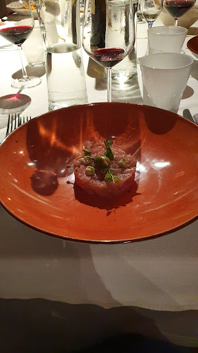 Read moreSono stato in questo raffinato ristorante con la mia ragazza per il suo compleanno. Essendo una sorpresa, mi ero accordato con il gestore per far trovare un piccolo pensiero e subito mi hanno tranquillizzato dicendo che se ne sarebbero occupati loro. Appena arrivati, veniamo accompagnati in una sala ricavata da una vecchia corte, molto carino, tenuto e ristrutturato ottimamente, intimo e romantico. Sul tavolo una rosa come regalo e subito ci vengono offerti due flute di prosecco. Il cameriere, un po' timido e poco sul pezzo, ma cordiale (forse alle prime armi) ci porta le liste e ordiniamo: un antipasto di fiocco, salame d'asina, formaggi, caponatina e marmellata di tropea, splendido da vedere e delizioso. Un altro antipasto di pesce, polpo scottato su letto di patate, molto bello e gustoso anche questo. Un primo, paccheri con melanzane, pomodorini e pecorino, cotti alla perfezione e molto saporito. Poi, un secondo di carne, carrè di vitello neozelandese con gorgonzola e broccoletti, da favola, e uno di pesce, filetto di spada in crosta di mandorle, non eccezionale ma comunque gradevole. Infine, due dolci, dei tortini di cioccolato con cuore caldo e gelato alla crema, non al pari della maggior parte del resto ma comunque molto piacevoli (ah, e qui è arrivata pure la candelina di compleanno dentro al tortino, molto molto gentili). Il tutto accompagnato da una bottiglia di morellino (lista dei vini molto corposa e interessante) per un totale di 110€. Insomma, sfido a trovare da queste parti una qualità, una quantità (i piatti sono tutti da giusti a quasi abbondanti), una cortesia, una location, un rapporto prezzo e un'atmosfera del genere! Da provare...